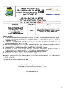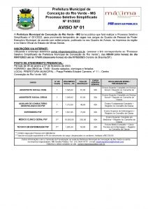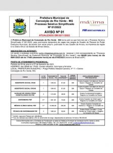 A PREFEITURA MUNICIPAL DE CONCEIÇÃO DO RIO VERDE torna público que fará realizar o Processo Seletivo Simplificado 01/2022 para preenchimento de vagas em vários cargos. Inscrições de 09/01/2023 a 07/02/2023 – Edital completo afixado no quadro de avisos e no site portal.mbgestaopublica.com.br 01/11/2022. Pedro Paulo – Prefeito Municipal