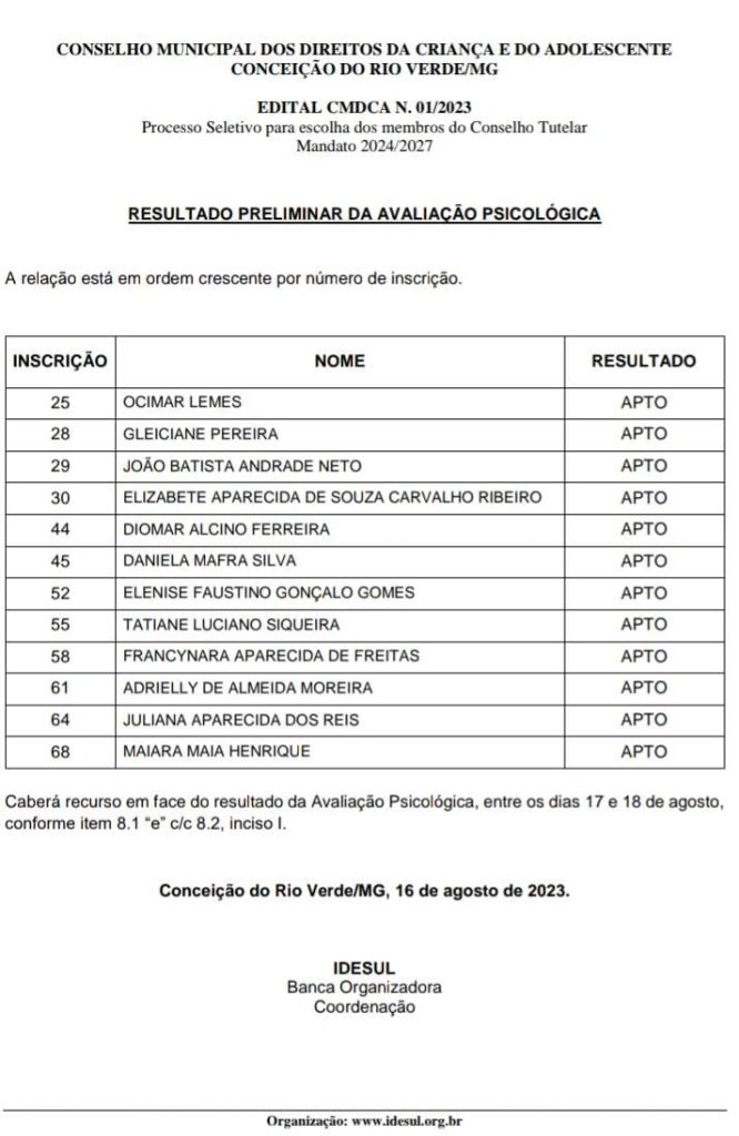 RESULTADO PRELIMINAR DA AVALIAÇÃO PSICOLÓGICA -Processo Seletivo