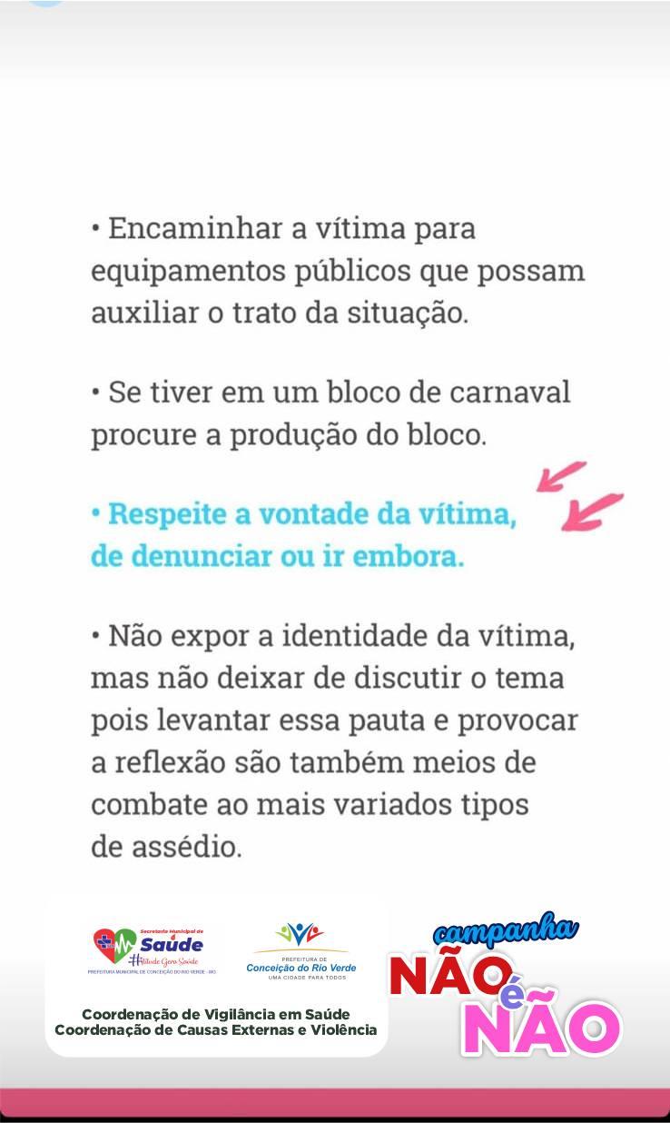 Em meio à alegria do Carnaval “Magia das Cores”, queremos reforçar nosso compromisso com um evento seguro, respeitoso e inesquecível para todos. A campanha “Não é Não”, da Secretaria de Saúde, por meio das Coordenações de Vigilância em Saúde e Causas Externas e Violência, continua a todo vapor!