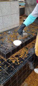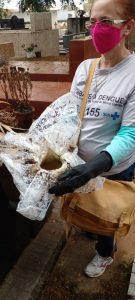 No local, a agente de endemias realizou a vistoria nos vasos de plantas e outros materiais, e recolheu com a ajuda do funcionário municipal, plásticos (que embalam flores) e descartáveis (Garrafa Pet) que possam acumular água e servir de criadouro para o Aedes aegipty. Em situações em que não é possível retirar a água acumulada, é aplicado o larvicida e também areia para impedir que o mosquito se prolifere.